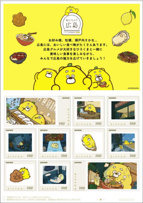HIT ひろしま観光大使兼おいしい!広島アンバサダーであるこのキャラクターと、広島のおいしい食べもののイラストを題材にしたフレーム切手で